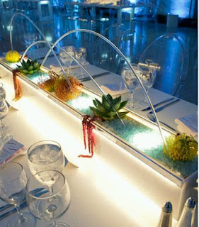 Uno de los arreglos más bellos y originales que se pueden tener, consiste en una base rectangular larga dentro de la cual se coloca agua y gemas de color azul aguamarina, en la parte superior se colocan plantas y unas mangueras que crean la apariencia de juegos de agua.