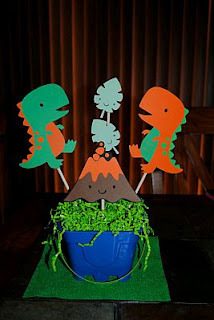 Si prefieres los centros de mesa más tradicionales, aquí tienes unos con base amplia para colocar las golosinas y en la parte superior la imagen de un dinosaurio.